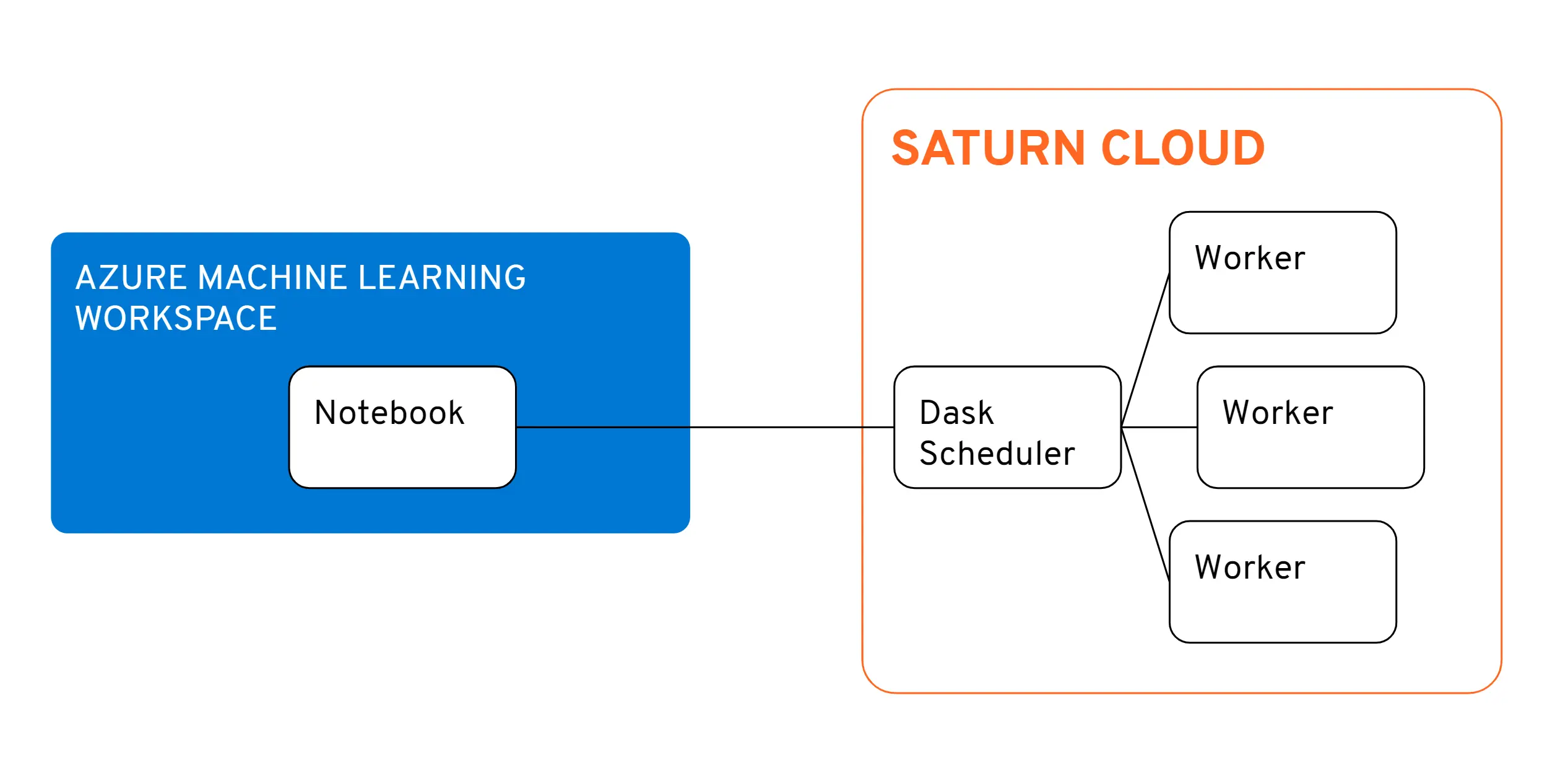 Saturn Cloud is a platform for data scientists to easily work—allowing them to start and stop data science resources, use GPUs for machine learning, and run distributed code through Dask. Saturn Cloud is available to connect to through all major cloud providers, and even directly from running Python on a laptop. For Azure, you can use the Azure Machine Learning Workspace to create a notebook that uses Dask through Saturn Cloud. You could also connect from an Azure virtual machine or any other Azure resource that can host Python. Your Python code running in Azure will connect to the Dask cluster to execute the Dask commands, and then the results can be returned to your Python environment.