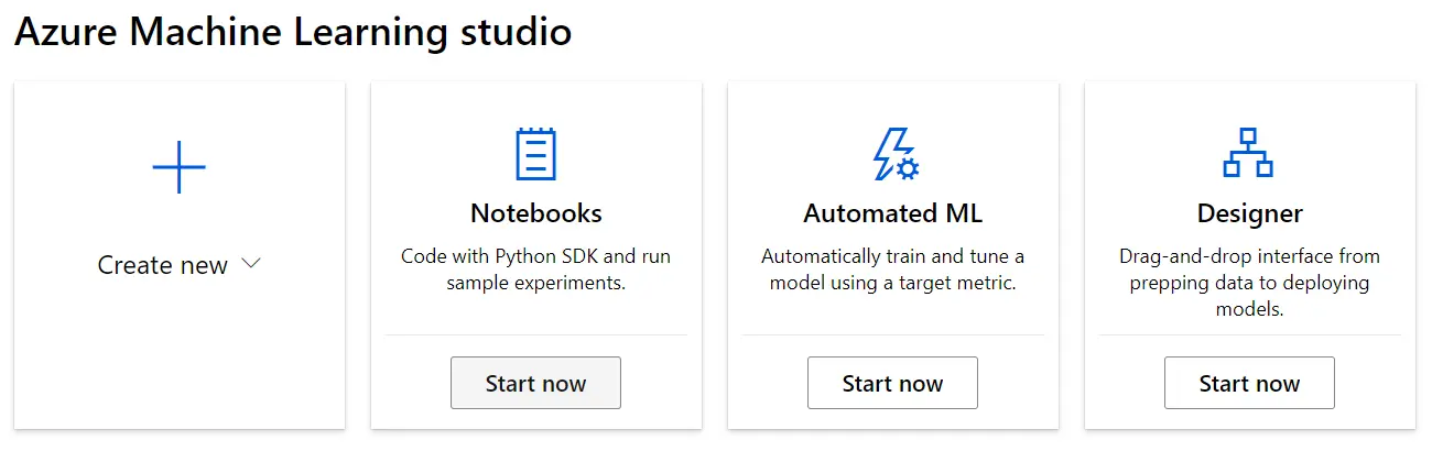 In the Azure Machine Learning Studio connected to the workspace you just created, select “Start now” under notebooks. When first using a notebook you may be required to choose a compute instance. For the purposes of this article it isn’t important (since the Dask work happens on the Dask instances not on the compute one), but depending on the task you want to do you may need a large instance.