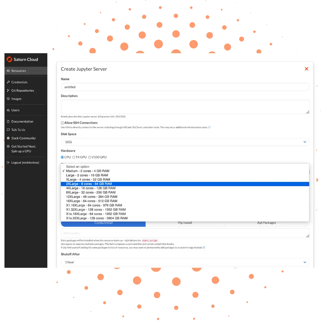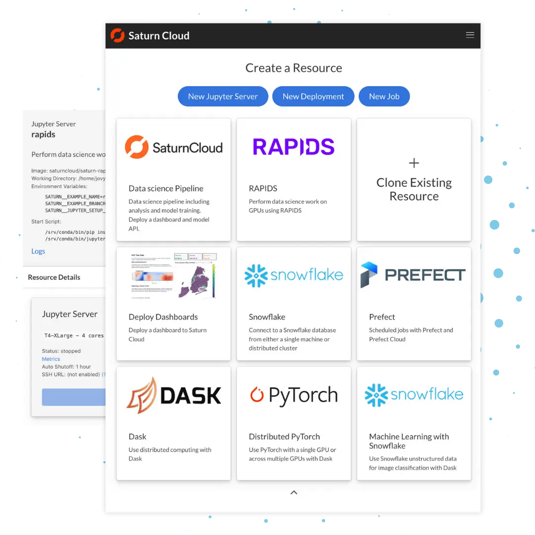 Saturn Cloud is an environment for all your best data science work because it doesn't limit what tools you can use. Our scaling, collaborating, and built-in management capabilities will aid you when you run your code. Spin up a notebook with 4TB of RAM, add a GPU, connect to a distributed cluster of workers, and more.