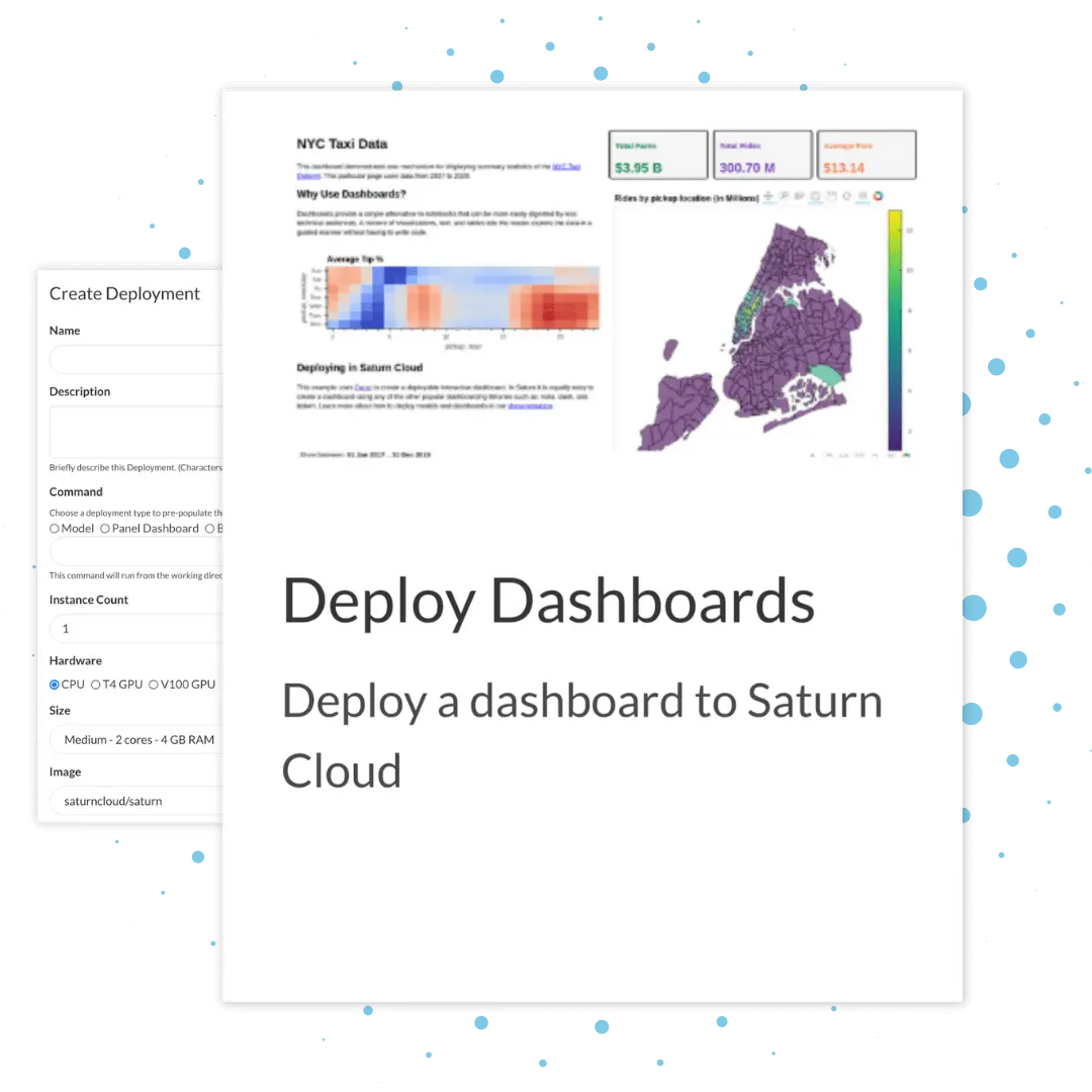 - Set up a dashboard or API that continuously runs with Saturn Cloud deployments.